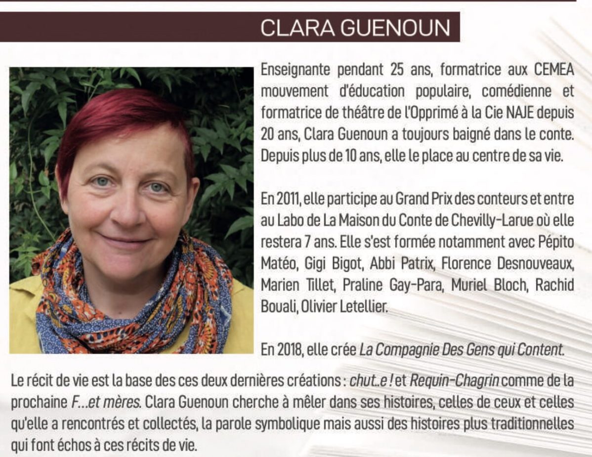 Que dire de Clara ? Qu’elle est une artiste formidable, c’est une certitude. Nous connaissons 2 de ses spectacles : Requin chagrin et Orca, tous deux porteurs d’une grande sensibilité et d’une émotion incroyable. Dans Orca, Clara partage la scène avec Nathalie Meurzac, elle aussi incroyable dans ce récit et avec Matthieu Beaudin à l’accordéon.
